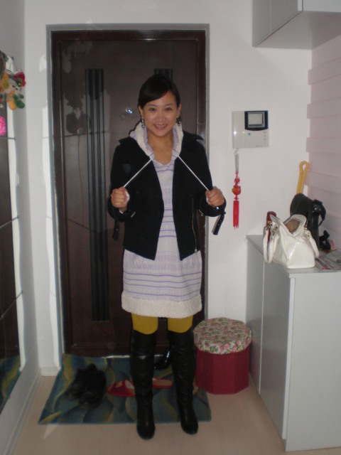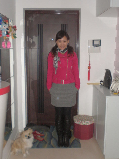 夹克+长裙,彩色棉袜是重点,淘宝上20米买的,很厚实,现在穿正好!
