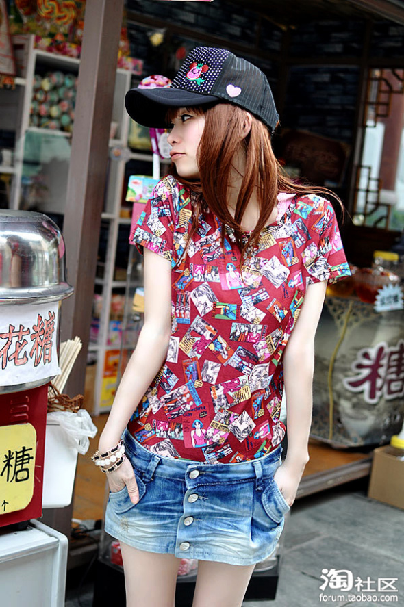 复古漫画T+混色水洗牛仔裙裤,帅气又潮感,