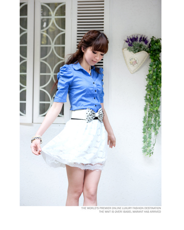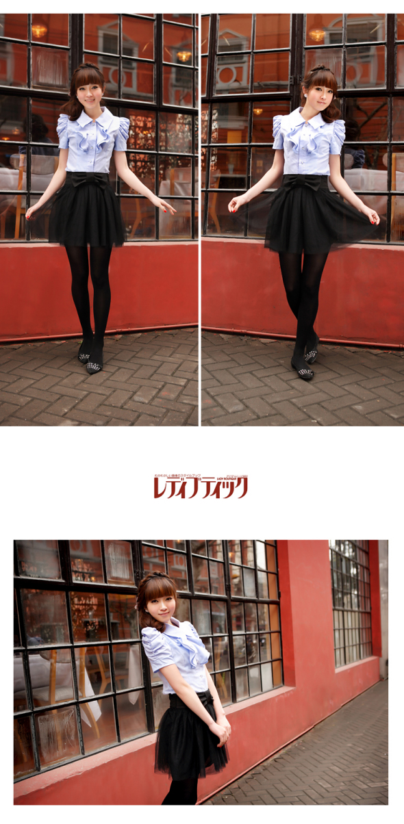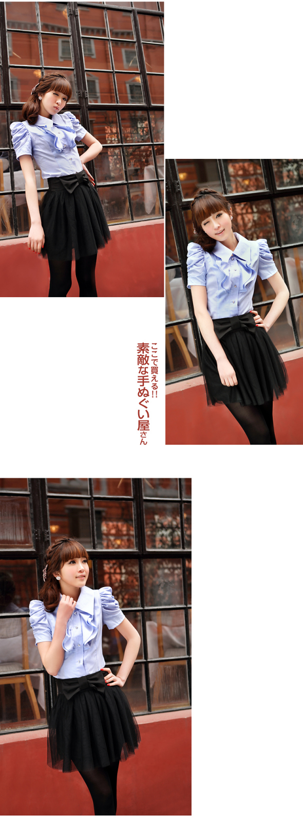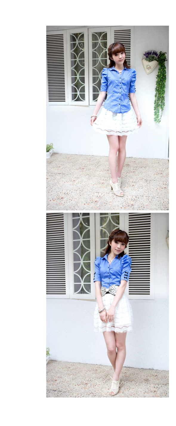 袖子和门襟处的黑色蝴蝶结与纽扣打破了纯蓝色衬衫的视觉效果,