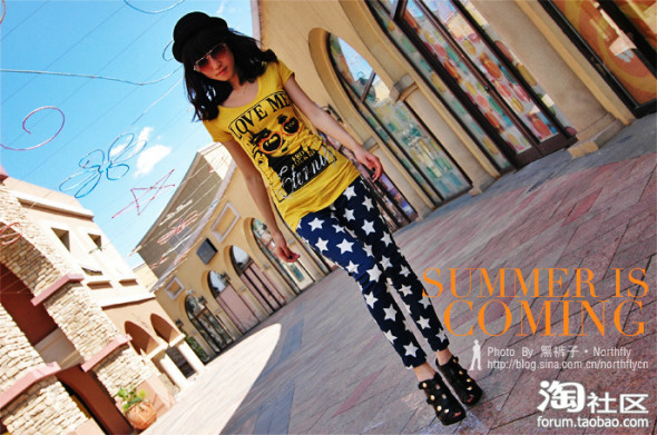 1.黄色HM眼镜T恤+蓝星星显瘦打底裤