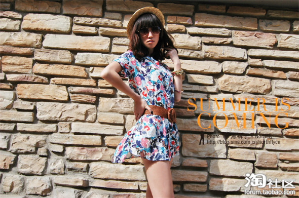 8。碎花短腰带连身裙