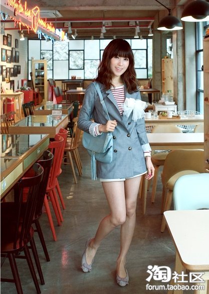 灰色的中性风格西装一侧修饰了立体的纱质蝴蝶结,十分清新甜美,顿显多变的风格,条纹T恤休闲又随意,短裤秀出修长双腿,十分性感。