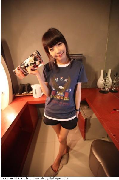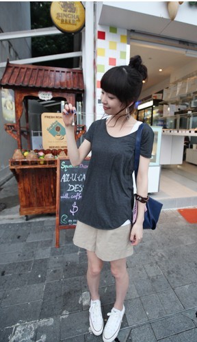 5.圆领短T,搭短裤,胸前的图案很欧美!