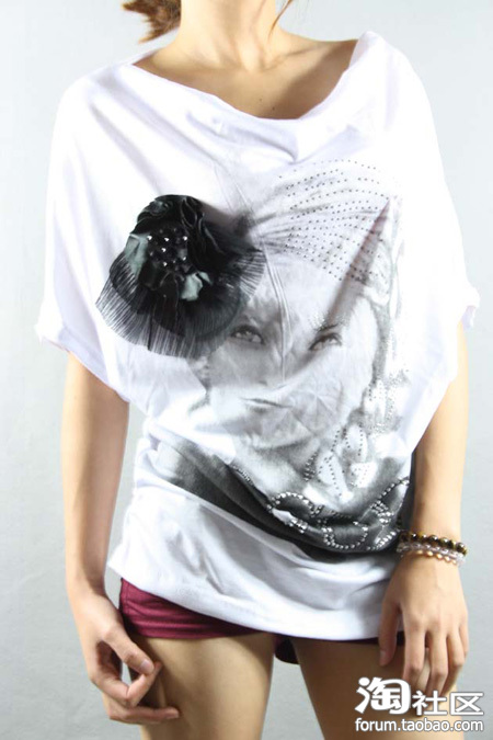 情调感-蝙蝠款-VOGUE镶钻字母,特色的人头像带花朵,收腰收腹,气质随意领,女人味十足