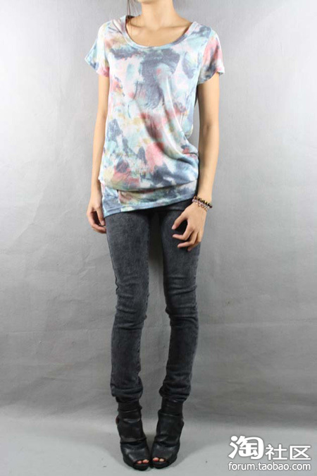 童话色彩印花中长款T,不规则车线,前后弧度呈现,短裤、小脚裤搭配的春夏潮物~