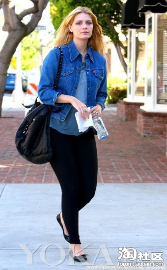 Misha Barton这件牛仔外套充满复古感,中短款的设计也让身材比例显得好一些。下身搭配黑色legging和平底鞋,让Misha Barton看起来十分舒服。