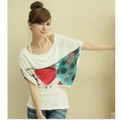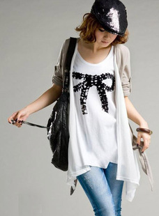 韩版 蝴蝶结 假两件套 中袖T恤衫 棉+雪纺