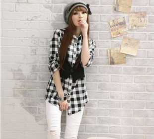 日韩学院风 格子衬衫连马甲 假两件套