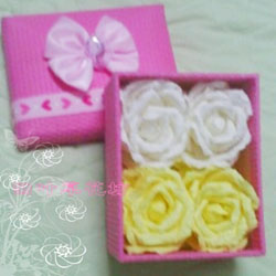 这是个玫瑰花朵礼盒,都是我亲手做的,每朵玫瑰花的花瓣都是我一片一片做出来的,