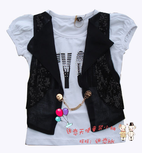 黑色马甲T恤/假两件套,亮片马甲香奈儿金属元素,泡泡袖¥48.00元