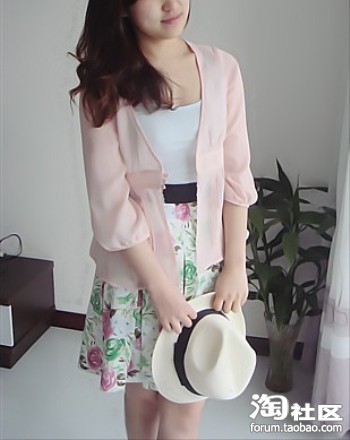 去景点观光,单品:浅蓝色的打底背心+这季最流行的花园感印花裙+粉色雪纺开衫+藤编草帽,既柔美又照顾到了防晒的需要。