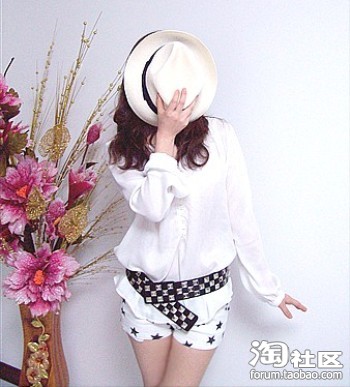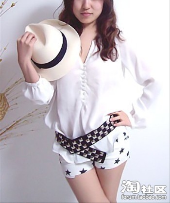 再去海边玩吧,单品:白色的蕾丝衬衫+白色星星热裤+铆钉腰带+藤编草帽,帅气吧