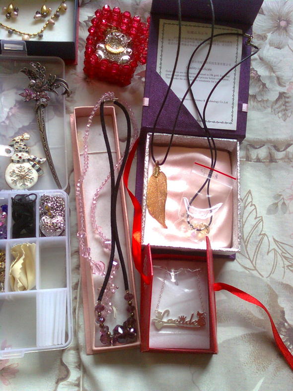 这是偶滴纯银收藏,现在淘宝的目标也偏移到了银饰.还记得偶滴初恋就送了偶一件伊泰莲娜的纯银星座项链,当时激动滴偶啊,只可惜多年过后物是人非,可爱银的习惯却保留了下来.上面这些是最近淘的,最爱是猫咪吊坠,上面提到过,还有就是花朵系列了,尤其是盒子里的足银耳钉,大爱啊,华丽又不张扬,现在偶滴耳朵上就挂着一付呢,一点都没不适的感觉,银子就是舒服.