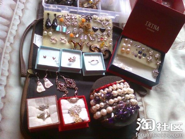 最后来看看耳饰手链和戒指,盒子里是银的,手链比较偏爱珍珠,是去年去青岛度假时买的,绝对的真珍珠.不过现在又爱上了银镯,现在手腕上就带着两个呢.还要说一下,第二个红盒子里是自己编的施家水晶戒指,改天专门来秀.