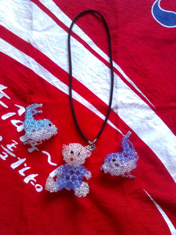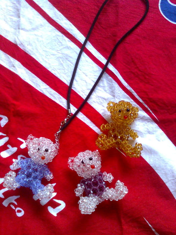 这是自己编的水晶熊,配了根链子当毛衣链了,狠可爱吧.旁边是海豚,也是水晶滴~