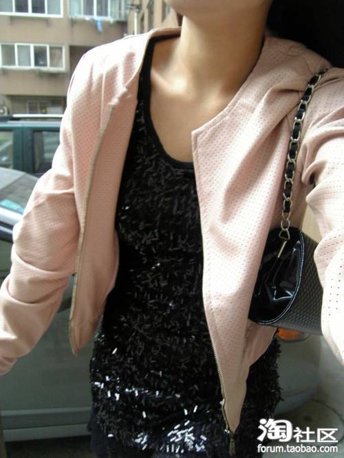 套上烟粉色的打孔皮衣外套~它具有一定的透气性~在春天的早晨也不会觉得热哦~