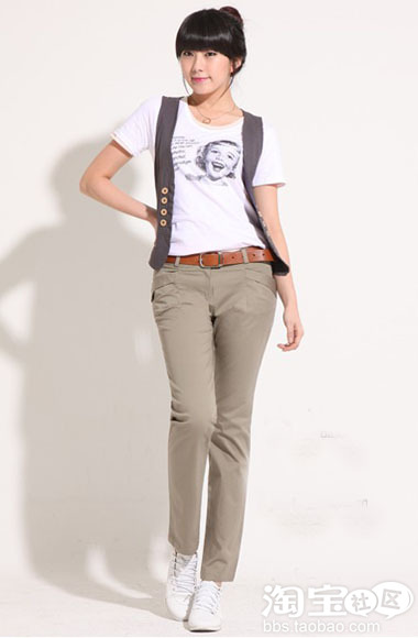 休闲的卡其色裤装最适合春日出游,方便又不失优雅,搭配白色运动鞋更有休闲运动感,纯白色的小T恤搭配修身马甲穿出层次感,甜美和帅气集于一身。
