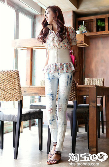 破洞牛仔裤虽然现在很流行,但想要穿出甜美风,也不是那么容易!粉可爱印花衬衫,甜美十足,收腰设计露出小蛮腰女人味十足,与浅色的裤子很协调,集可爱与时尚与一身的搭配必定成为靓丽风景线。