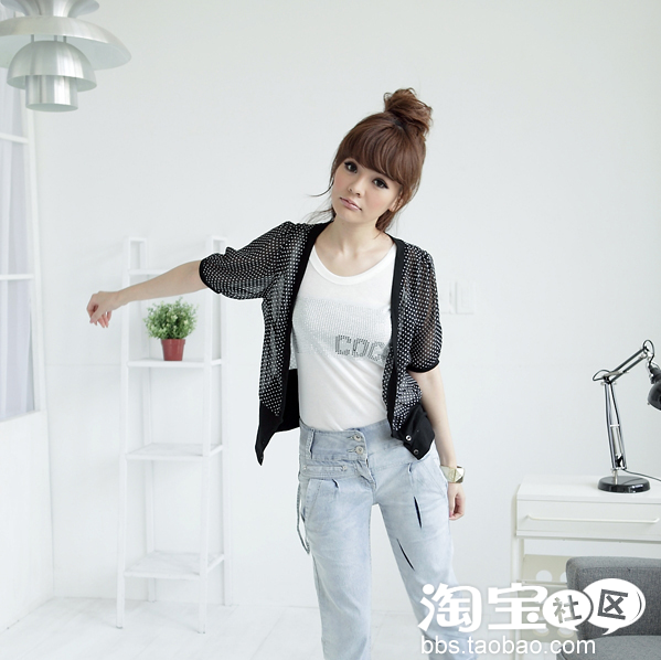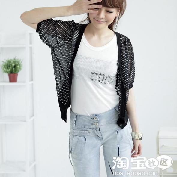 NO。1可爱圆点百搭小开衫+紧身T恤+中腰紧身牛仔裤 打造公主气质风