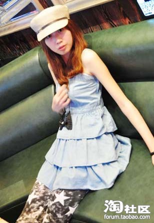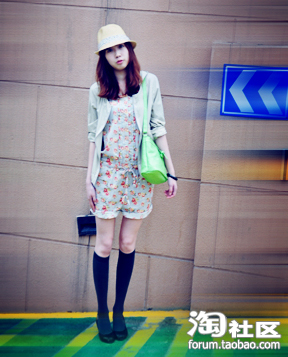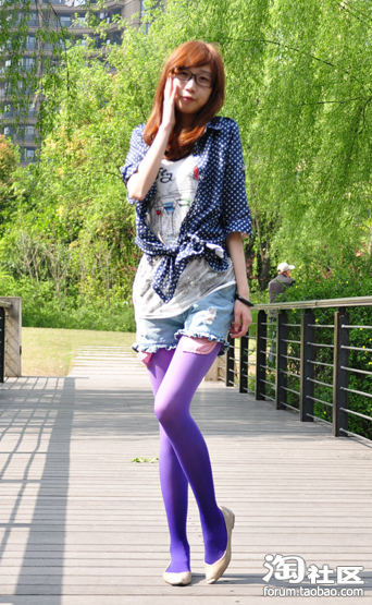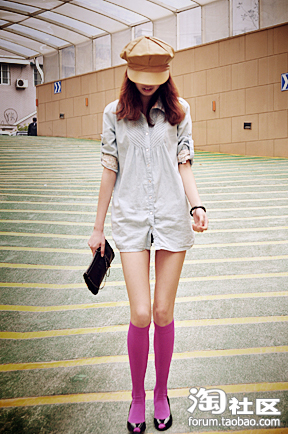 帽子+牛仔衬衣+短裤+小包+彩色中袜+黑色鱼嘴鞋