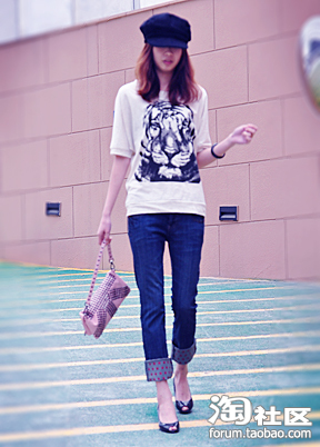 帽子+T恤+卷边牛仔裤+挎包+鱼嘴鞋