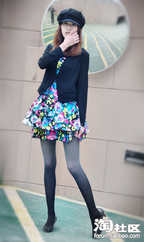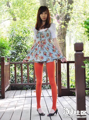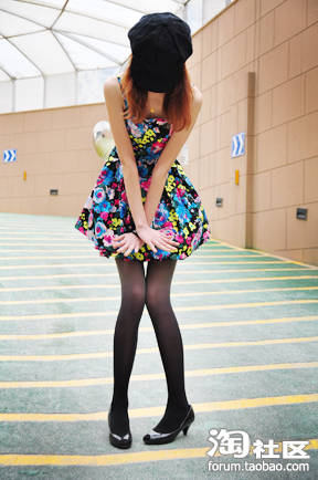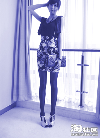 玫瑰连衣裙+小挎包+黑色丝袜+高跟鱼嘴鞋