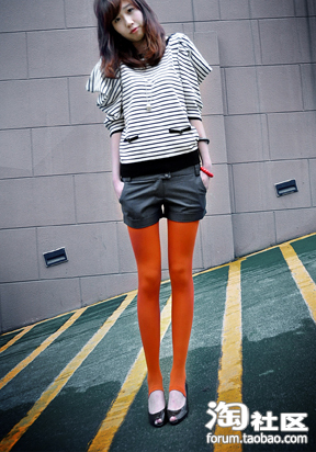 条纹蝙蝠衫+西装短裤+彩色丝袜+鱼嘴鞋