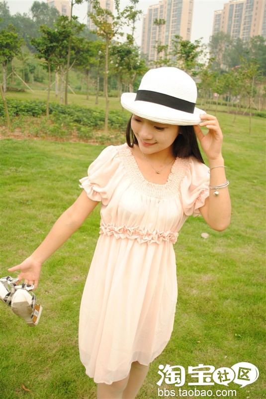 5:粉红色雪纺连衣裙+白色圆帽+小坡跟凉鞋打造温柔淑女风
