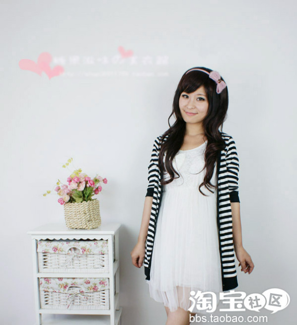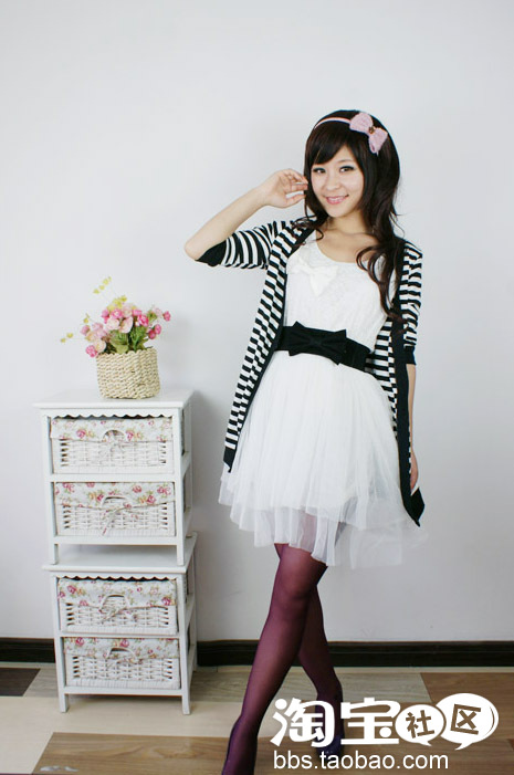 经典时尚的条纹开衫搭配什么都很完美,搭配上白色蕾丝纱裙 一种纯真简约的味道