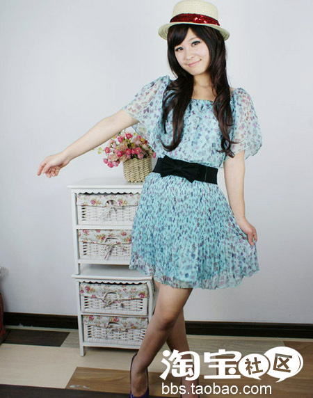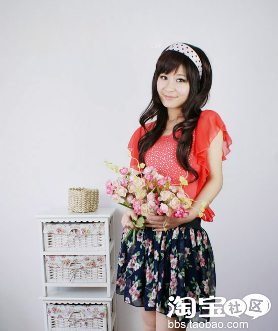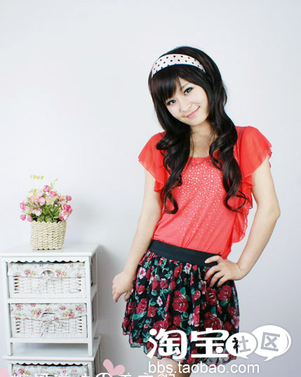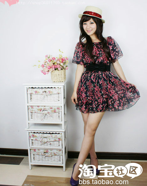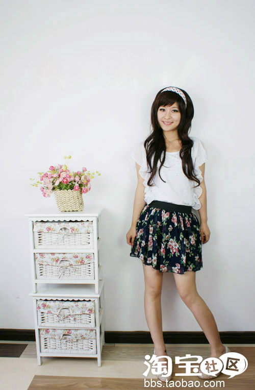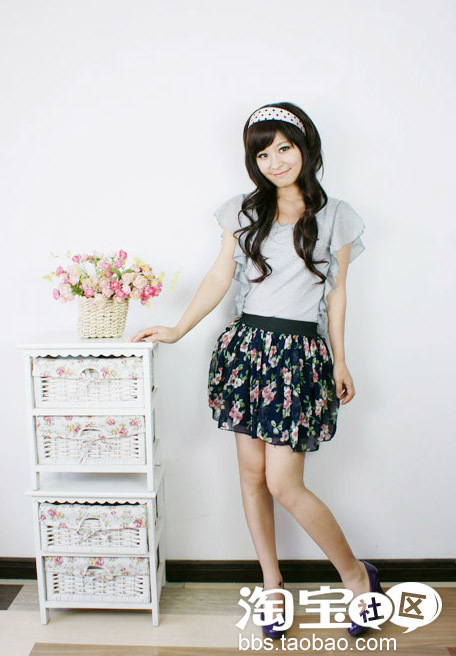 雪纺荷叶袖T +收腰花柄雪纺短裙