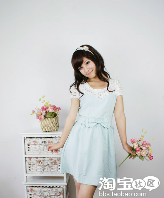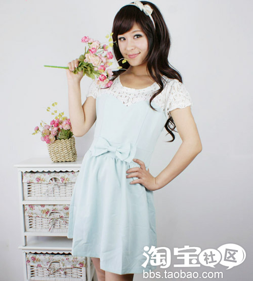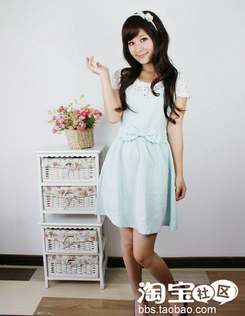 肩部整片蕾丝拼接的设计加上腰间的蝴蝶结