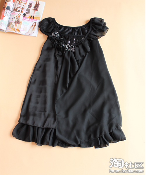 雪纺面料带来的就是甜美的感觉,黑色又怎么样呢,花朵和荷叶叶一样让你很女人