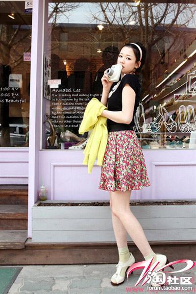 黑色短袖T恤搭配碎花短裙,淑女又很甜美