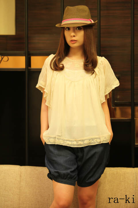 彩虹帽再搭twenty one米色蝴蝶袖刺绣雪纺衫,有没有觉得包子的新发型很有女人味呢