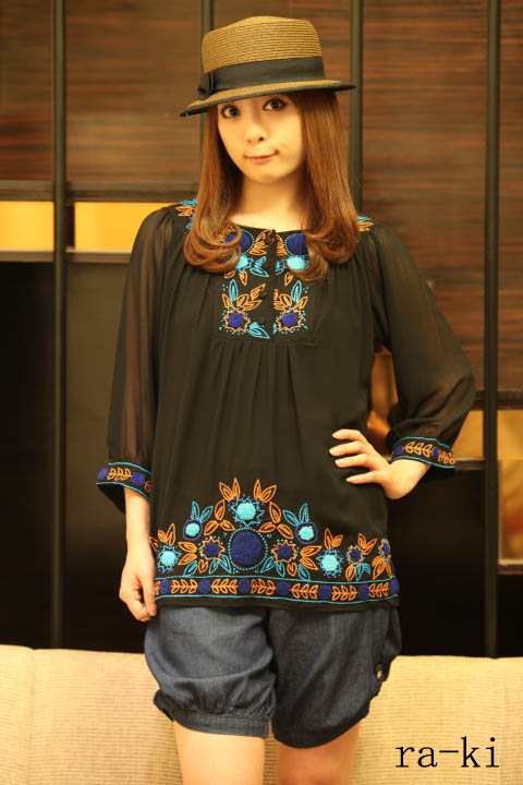 蝴蝶结装饰棕色草帽搭ANNA SUI民族风刺绣真丝上衣