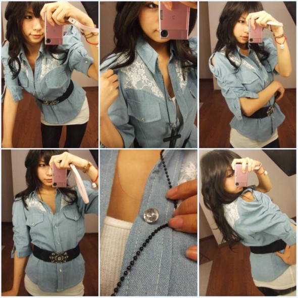 最后一个,VIVI上的牛仔衬衫,肩膀有蕾丝。佩服设计师,可以把粗矿和温柔结合在一起 ~~喜欢