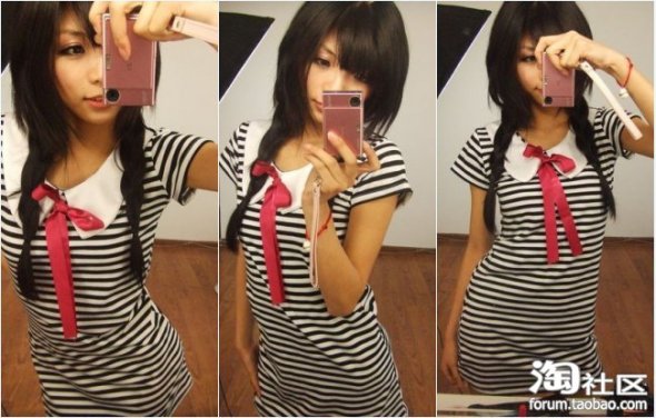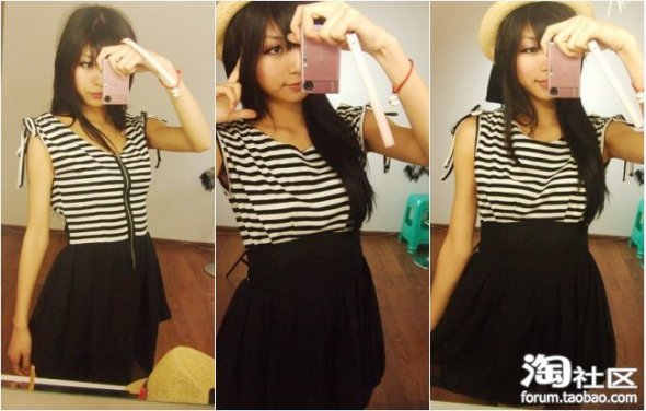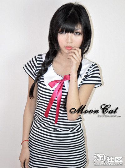 这件水手群子,装嫩用~~哈哈,回正题,因为是横条纹,时候瘦弱的MM穿可以显得有线条。胖的MM就不要了,横条会显得更胖,应该选择竖条纹。