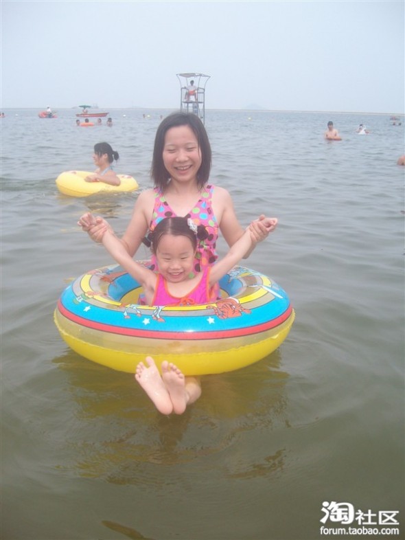 妈妈!你可得把我抱紧了,我可不想这个季节在这游泳!