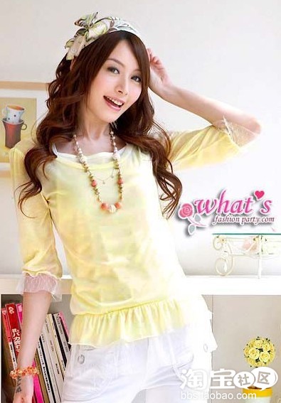 淡淡的黄色上衣搭配白色的七分裤给人一种清新淡雅有不是可爱的感觉。