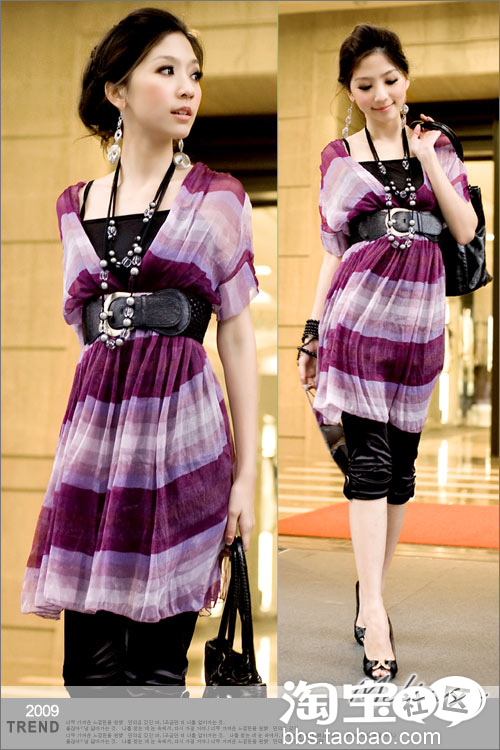 5,条纹风,条纹两件套两穿款短袖雪纺连衣裙,我想大多数美女也喜欢条纹的衣衣吧,此款条纹两件套也是两穿款,雪纺的布料给夏天增添了不少凉爽,宽宽的横条时尚又大方,是美女们不可少的一款哟!