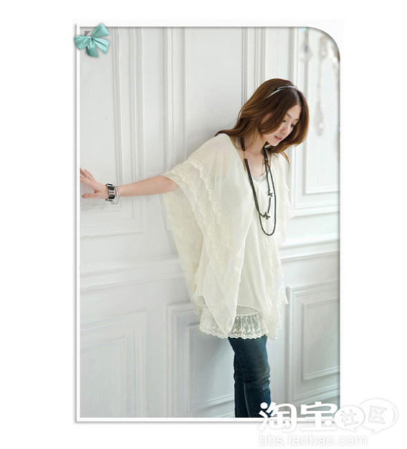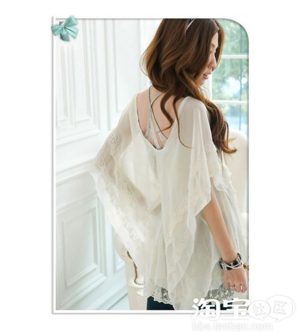 6,拉风的女人,韩版蕾丝花边蝙蝠袖两件套雪纺衫雪纺上衣 ,此款衣衣本人好喜欢哟,不管胖瘦都可以穿出不同的风格,设计非常独特,特别是双手赞开后背形成蝴蝶般的样子,真的好美好美,美女们可以备一件这种我格的YY