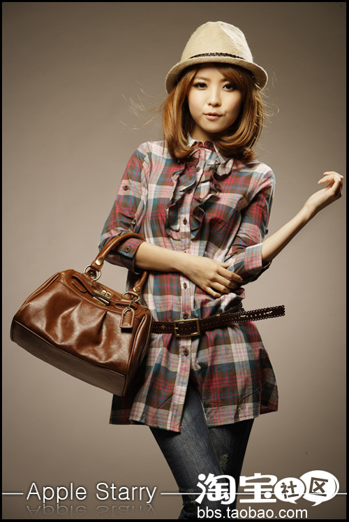 7,干练衬衫格子风,英伦风 格子七分袖翻领荷叶边衬衫上衣,此款衬衫有大大的荷叶边,小翻领,中袖,格子长款,简单大方,尽显OL风,下面可以配打底裤,也可以配长裤都可以的,不管上班或是休闲都可以穿,不挑年龄场所,是一款百搭的衬衫。