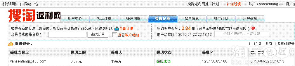 刚发现了一个很好的淘宝购物省钱网站:淘宝购物返利网站――搜淘返利网:www.sotao5.com,拿出来与大家一起共享,经过简单的email注册并通过这网站链接到淘宝网上完成交易,确认收货付款后就可以享受最高达50%的返利,而且现在去注册马上送2元现金,累积满5元就可以申请支付了.该网站还支持朋友推广,只要你的朋友通过你的推广链接进行注册,你就能最高享受被推广者返利金额的50%的佣金收入。只要有了支付宝,您就可以快捷的从搜淘返利网获得返现的金额。赶快去注册一个并收藏这网址吧,也许会为你省下不少钱。