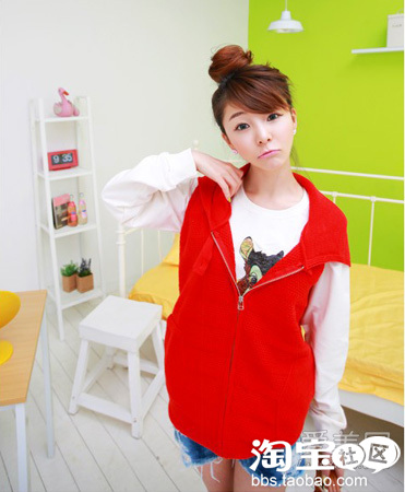 大红色的背心针织衫把原本只是T恤加牛仔裤苦闷的搭配全打掉了,搭配丸子头的话俏皮可爱。