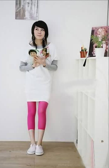 下面搭配上可爱的打底裤,更是充满了少女的甜美感哦。