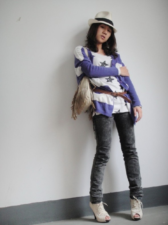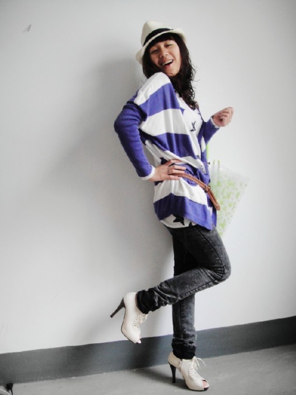 №.2 蝙蝠袖蓝白开衫+欧美打底+蛇皮裤+美腿高跟