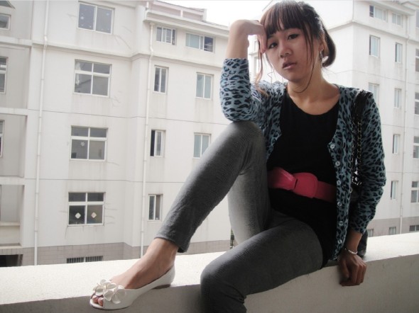 №.5 抢手豹纹开衫+亮皮打底裤+亮色宽腰带