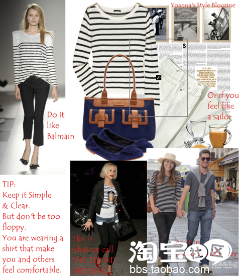 条纹衫=简单+快乐+轻松。所以与其绞尽脑汁翻衣倒柜地为穿什么和怎么穿而头疼,不如一切从简。但是,也不要太随便了。如果要穿出气质,就要选择品质好一点的单品,衣着整齐精致,全身颜色不要超过3种而且最好的同一色系的不同深浅。平底鞋、款式简单剪裁精致的裤子还有一件素雅的条纹衫,会让整个人看起来有气质许多。我们不是名模,我们没有完美的身材。我们肚子上有肉,所以我们穿一件略为宽松的衫;我们腿有点粗,所以我们喜欢显瘦的黑色直筒牛仔裤;我们受不了穿高跟鞋走路带来的疼痛,所以我们喜欢舒服的平底鞋。舒服自在的你,做自己的你,自信的你,快乐的你,会把这种如空气一般的自然气息带给身边的人。