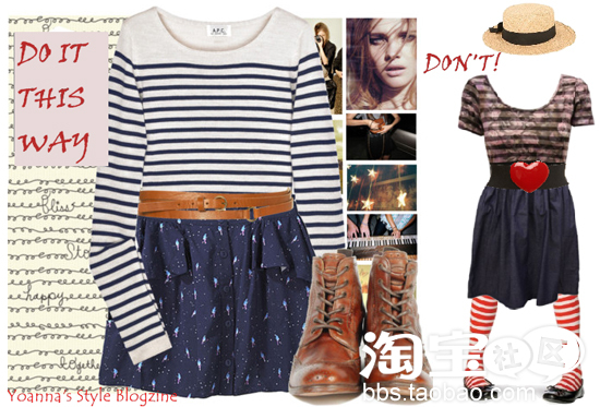 条纹衫中最受欢迎的,当属天蓝色条纹的“海魂衫”。这种带着海洋自由气息的款式,很受文艺小青年的追捧。但如果你以为把自己穿成大力水手就是复古,就是时尚,那就大错特错了。我经常在路上见到有姑娘穿着一件海魂衫,搭配一件碎花高腰短裙,腰间勒着宽大的黑腰带,腰带扣是红色大桃心或者夸张卡通图案,然后穿着血红色的长筒袜和外婆的旧皮鞋,或许头顶上还有一只草帽,涂着同样血红色的嘴唇,十分招摇。