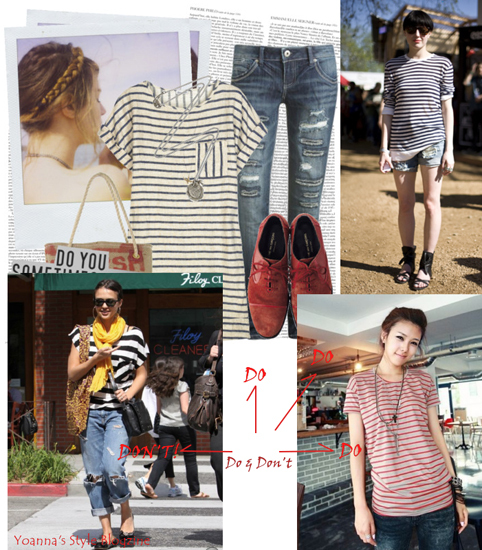 Boyish Style横扫全世界。从名模到“春哥”“曾哥”,女孩子们似乎都不太满足于做个大门不出二门不迈,轻声细语温文尔雅的乖女孩。条纹衫其实本来就是渔夫穿 的,被Coco Chanel拿来改成女装,就成了“假小子”的经典。搭配牛仔裤是绝对必要。但铅笔型的超slim就不要考虑了。直筒的,有些肥的,再来点破洞的 Boyfriend牛仔裤和条纹衫简直就是天仙配。不过,boyfriend牛仔裤因为本身就比较肥大,所以对身材要求比较高,容易显得人下身太短,或太 胖。所以,完美的身材就要从“条纹衫”上找不回来。不要选择宽条纹!因为那样的横纹会让人上身看上去太壮实。不要太贴身,也不要太肥大!太贴身容易暴露你 的肉,太肥了就会变成Jessica Alba这样,上身如同女巨人!